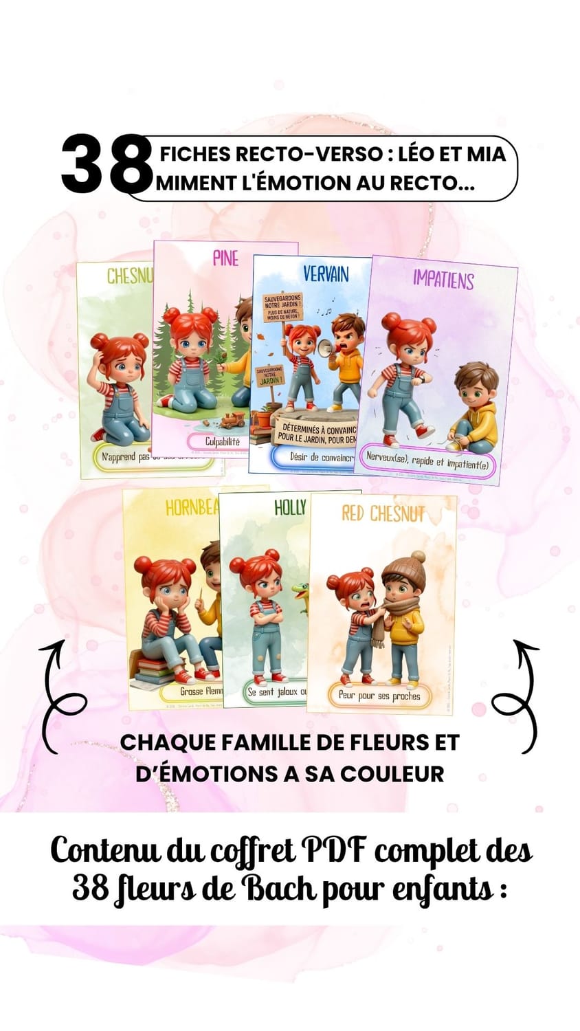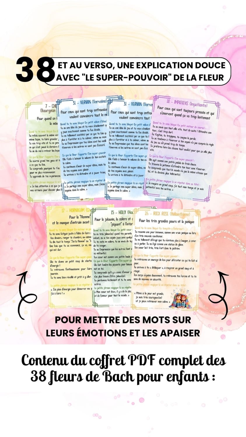 🌿 L'Herbier des Émotions : Pour chaque émotion (peur, incertitude, tristesse, etc.), une fiche magnifiquement illustrée qui indique la Fleur de Bach correspondante. Fini les doutes, vous saurez exactement comment aider votre enfant !